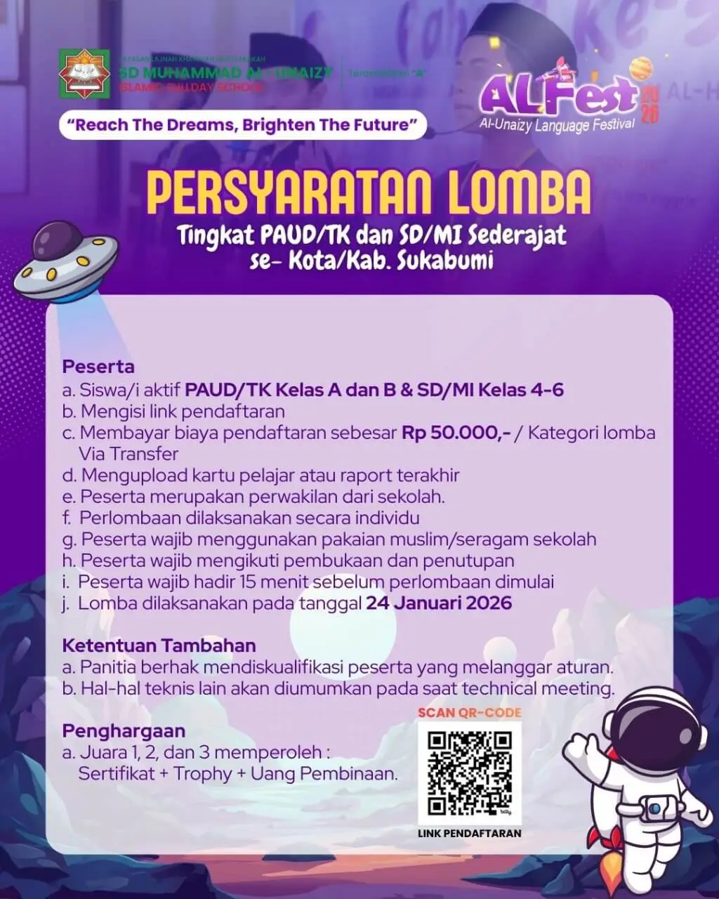 AL-UNAIZY LANGUAGE FESTIVAL 2026 pertama kali hadir sebagai ajang bergengsi untuk menggali potensi, menumbuhkan kreativitas, dan meningkatkan kemampuan berbahasa para peserta didik. Jangan lewatkan kesempatan emas ini!